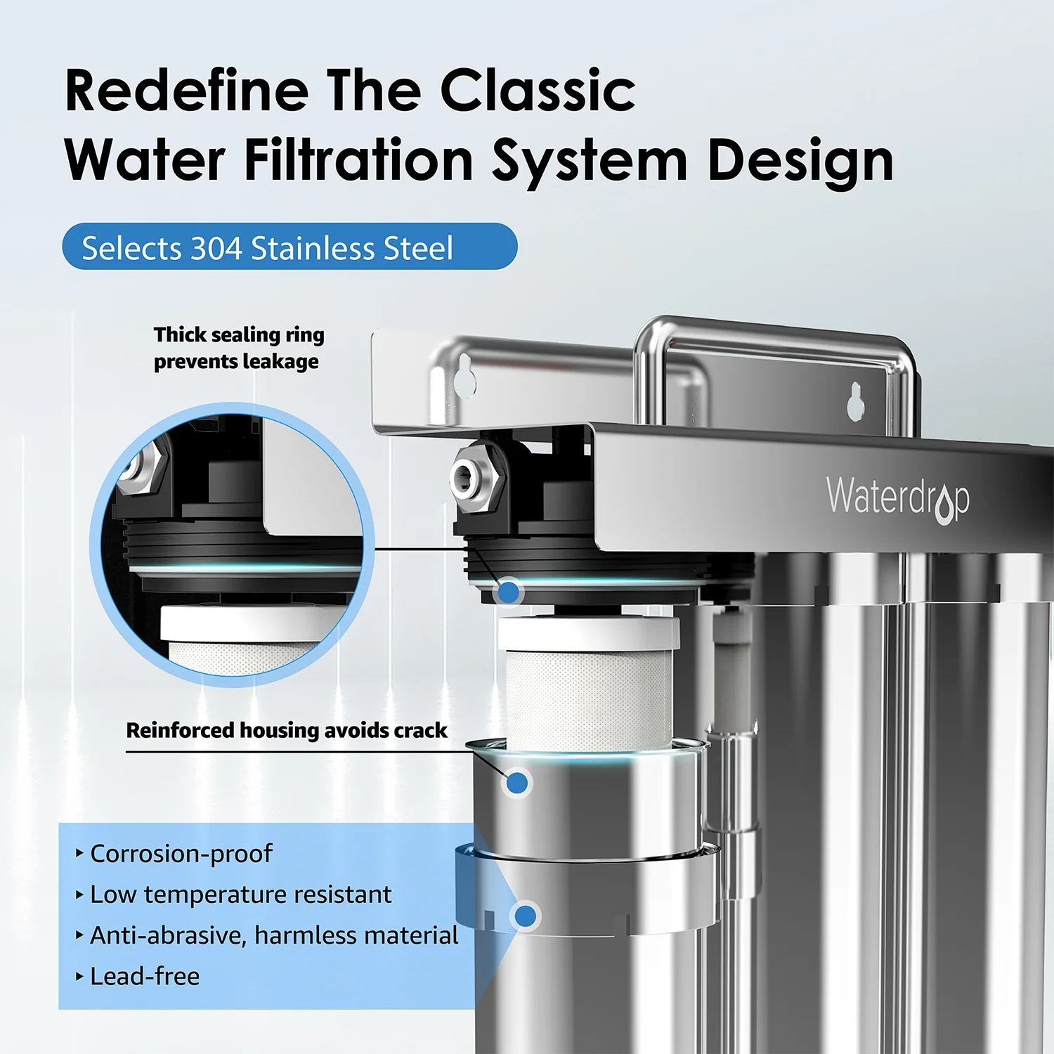 - [Selected materials] The lead-free 304 stainless steel material makes the stainless steel 3 stage filtration system resistant to corrosion and compression. The thick sealing ring in the cap prevents leakage.