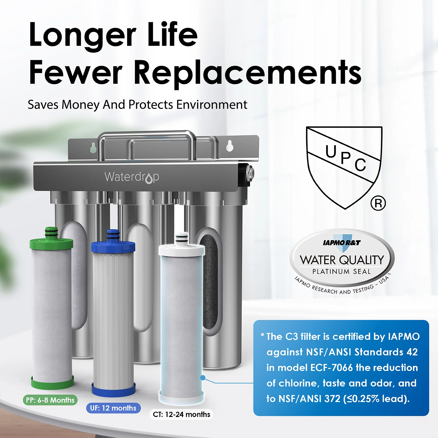 - [Recyclable housing] You don’t need to replace the stainless-steel housing. Just replace the inner filter once the filter expires. The PP filter lasts 6-8 months, UF filter lasts 12 months, and CT filter offers an ultra-long life of up to 24 months, which reduces replacement frequency. It ultimately helps to save money, while protecting the environment.