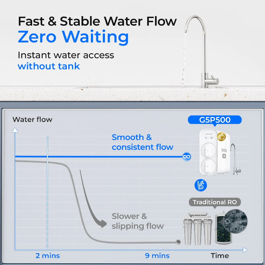 - [500GPD Steady Flow] With a powerful 500GPD (gallons per day) capacity, the G5P500 delivers a stable and rapid flow, filling a 6-oz cup of water in just 8 seconds. Enjoy instant access to purified water without waiting, perfect for busy households.