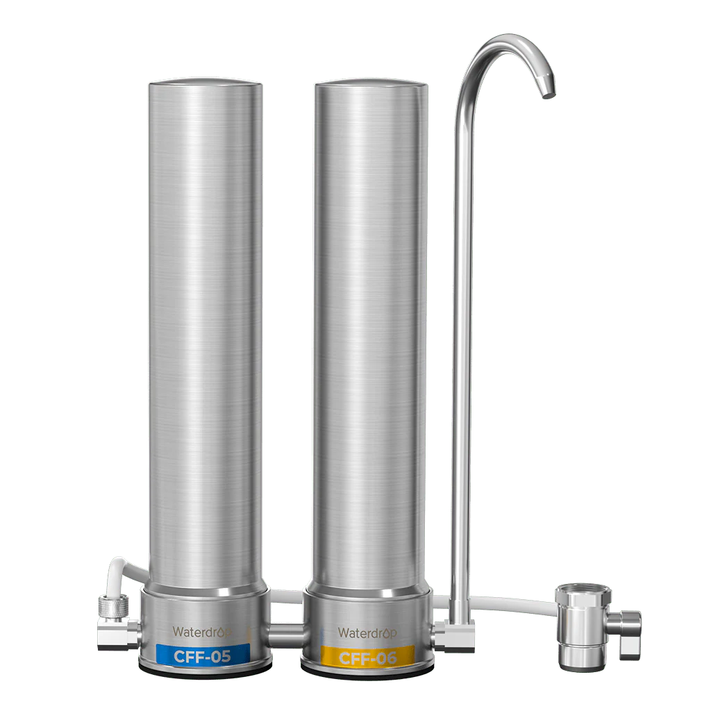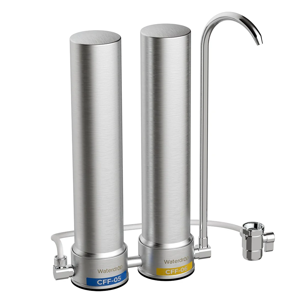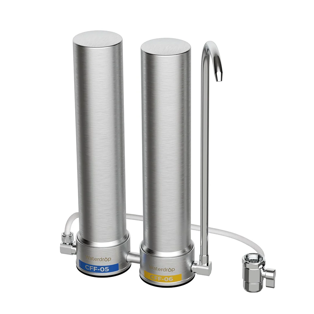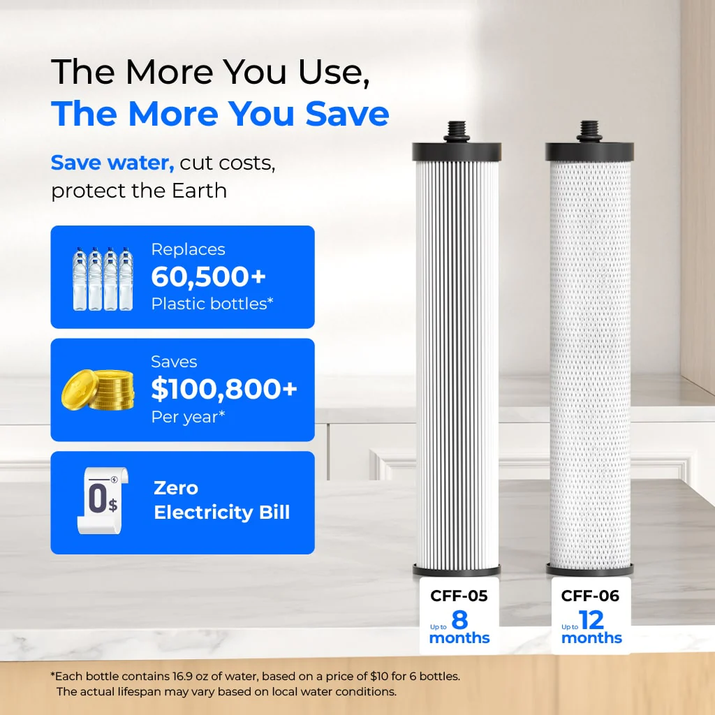 - Longer Filter Life, Less Waste:Save money and reduce waste with the Waterdrop Countertop Faucet Filtration System. Replace over 60,500 plastic bottles annually and save up to $100,800 per year*. The CFF-05 filter lasts up to 8 months, and the CFF-06 lasts up to 12 months, with zero electricity needed.