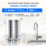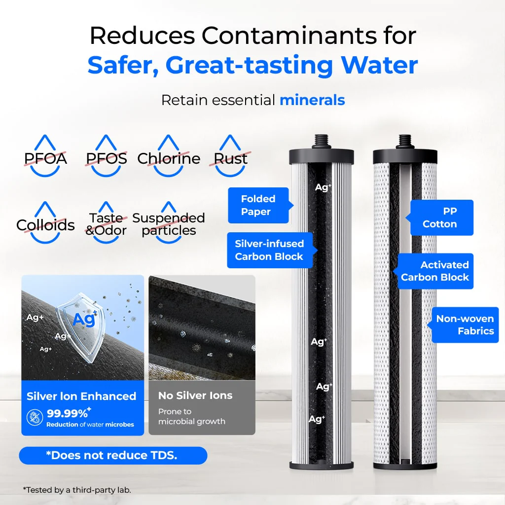 - Silver Ions for Fresher Water: This countertop water filter removes contaminants like PFOA, PFOS, chlorine, sediment, and rust, while retaining essential minerals. With silver ion-enhanced filtration, it inhibits 99.99%+ harmful bacteria and reduces microbial growth. Does not reduce TDS.