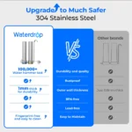 - More Durable 304 Stainless Steel Countertop: The Waterdrop Countertop Faucet Filtration System features a 1mm thick stainless steel countertop for superior durability, compared to other brands’ 0.8mm. It is rustproof, BPA-free, and lead-free. The fingerprint-free surface is easy to clean, and it passes 100,000+ water hammer tests for added reliability.